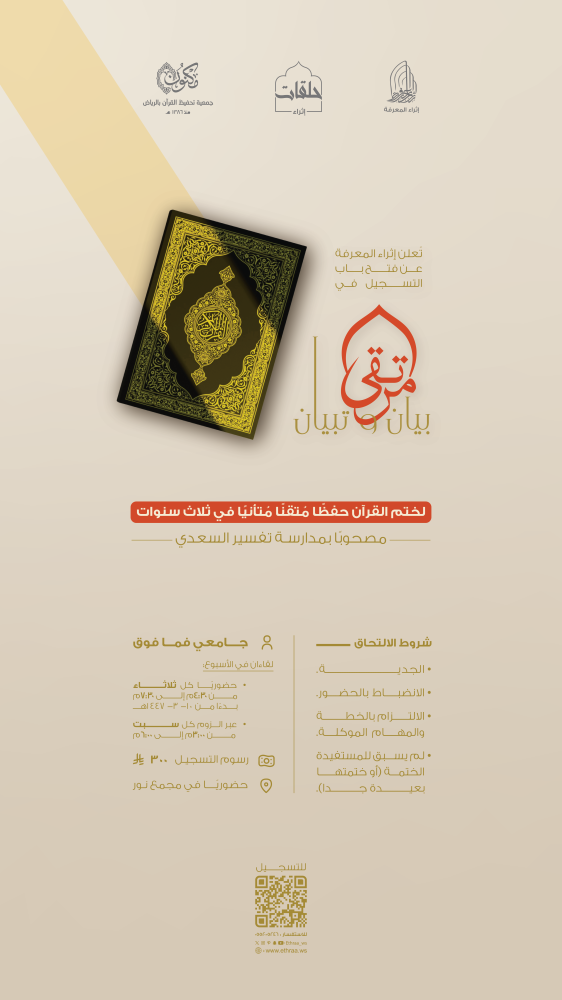 لختم القرآن حفظًا مُتقنًا مُتأنيًا في ثلاث سنوات، مصحوبًا بمدارسة تفسير السعدي.
