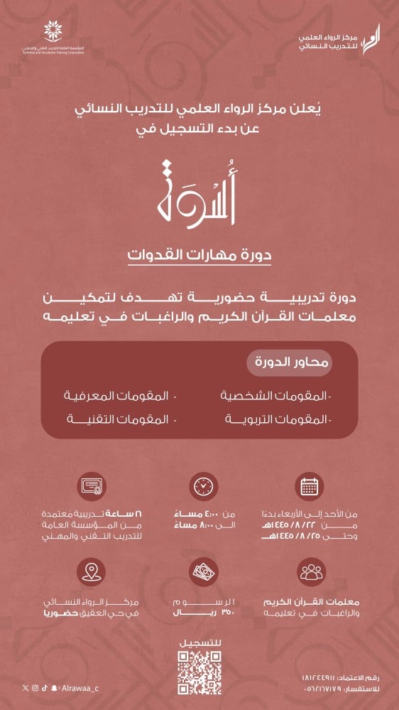 دورة تـدريبية حضـورية تهـدف لتـمكين معلمـات القـرآن الكـريم والراغـبات في تعـليمه.