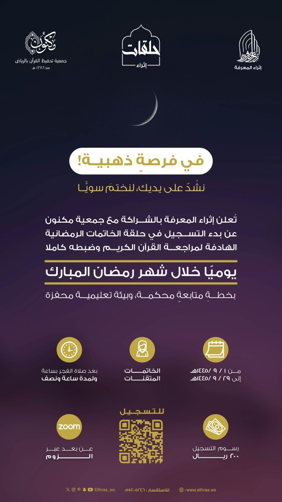 * تلتزم المستفيدة بحضور الحلقة (عبر الزوم) يوميًا، تبدأ الحلقة بعد أذان الفجر في مدينة الرياض بساعة وتستمر لمدة ساعة ونصف.